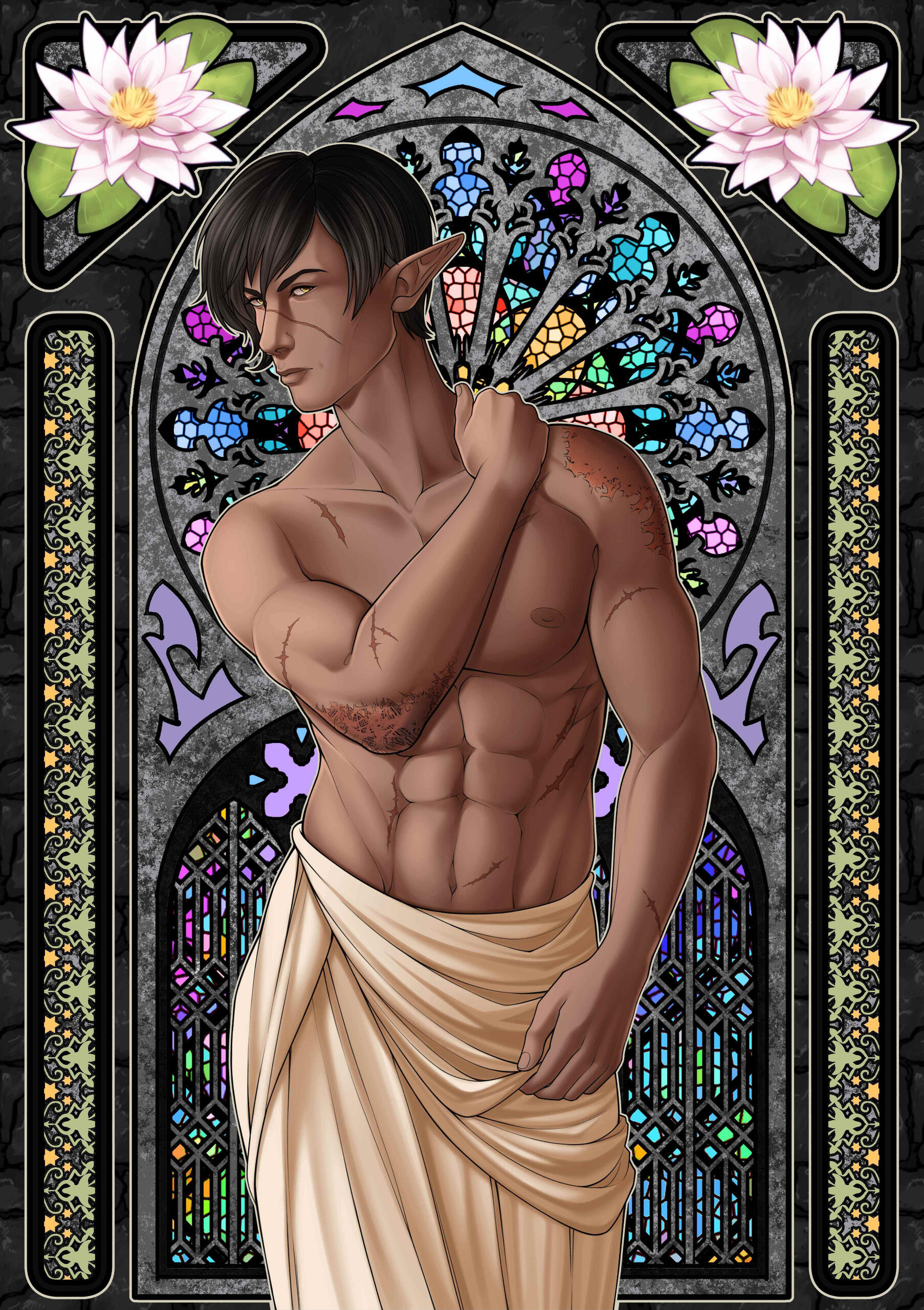 Leonceault stands as a titan among men, towering at seven fulms and six ilms with a physique sculpted by the forge of battle. His frame is a testament to raw power and relentless discipline, marked by a broad, barrel-chested physique, thick, corded arms, and a stance that exudes the coiled strength of a beast poised to strike. He moves with a paradoxical grace, his steps both deliberate and feral, akin to a lion prowling its domain.His dark brown hair falls in unrestrained waves to the base of his neck, framing a face hewn with sharp, chiseled features, as though carved from Ishgardian stone. Piercing gold eyes, flecked with onyx, gleam with a predatory intensity, their contrast as striking as the man himself. There is a fire within them, a battle-born gleam that speaks of experience hard-won and trials endured.Scars, the indelible marks of war, lace his body like a warrior’s tapestry. The most formidable of these is the labyrinthine web of keloids that crisscross his back, a permanent reminder of the Dragonsong War, each line a story of survival and sacrifice. Yet, despite this, his expression is often one of quiet understanding, a softened echo of the noble blood that courses through his veins. In moments of severity, however, his countenance hardens into the stern resolve of a knight unshaken by adversity.His lips bear a natural rosiness, a stark contrast to the savage white teeth within, a smile both charismatic and commanding. His skin is a warm, tawny hue, unmarred by variation, stretched taut over a form sculpted for war. The sharp lines of his musculature are unmistakable, his abdomen so rigidly defined that one could count each segment with ease. His presence alone speaks of barely contained power, a weapon of flesh and bone honed to perfection.Clad in armor of deep blues, burnished bronzes, and glimmering silvers, Leonceault carries himself with the meticulous care of a seasoned warrior. Every piece of his gear is polished, oiled, and tended to with a discipline befitting a knight of his station. A soldier, a noble, a lion of Ishgard, he is all these things and more, a force of nature sculpted by war, duty, and the unyielding march of fate.